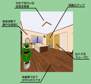 | 暖房方法は色々ありますが空気を暖める方法に比べて乾燥しすぎず、また不快な上下温度差がほとんど生じない床暖房が推奨される。 |